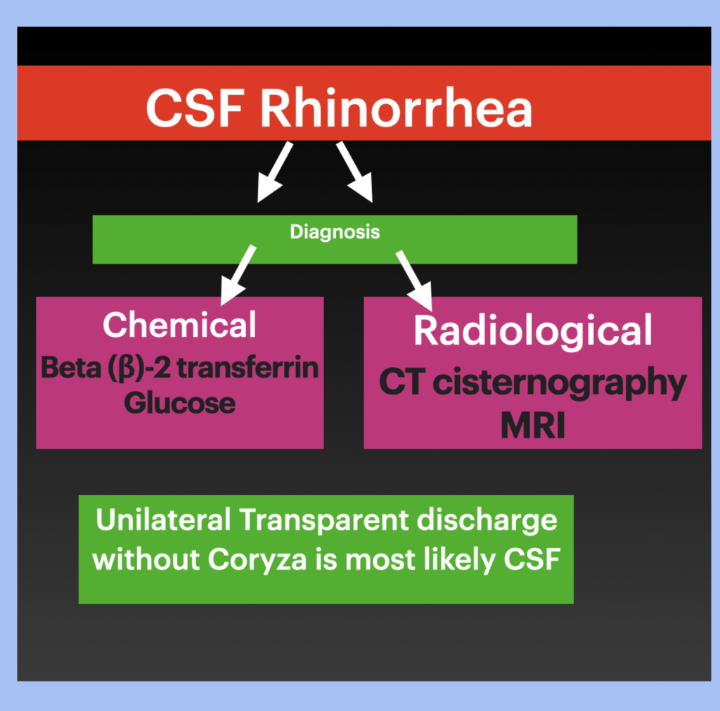 The diagnosis of CSF rhinorrhea usually requires testing the drainage from the nose for a protein called Beta-2 or Tau transferrin. This protein is only found in brain fluid.